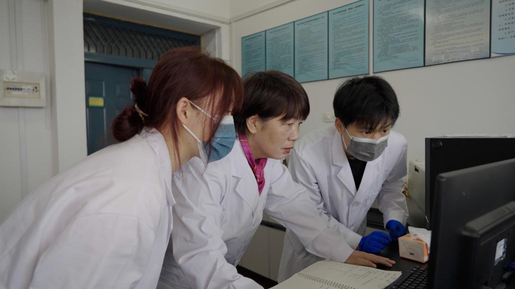 钱红飞(左二)指导团队科研活动